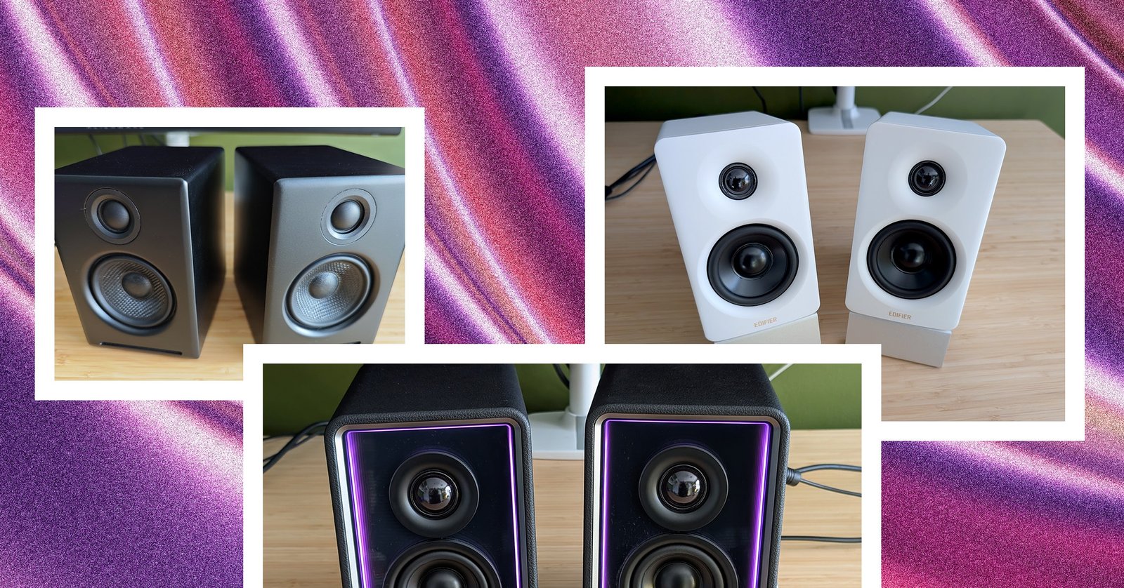 Edifier QR 65 black rectangular speakers with purple interior trim sitting on wooden desk