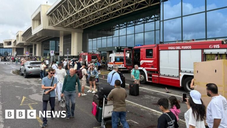 A busy Italian airport, which was partially evacuated after a man set fire to a registration area. Video footage published on social media shows chaotic scenes at Terminal 1 at Malpensa Airport in Milan, as a fire rages on one…