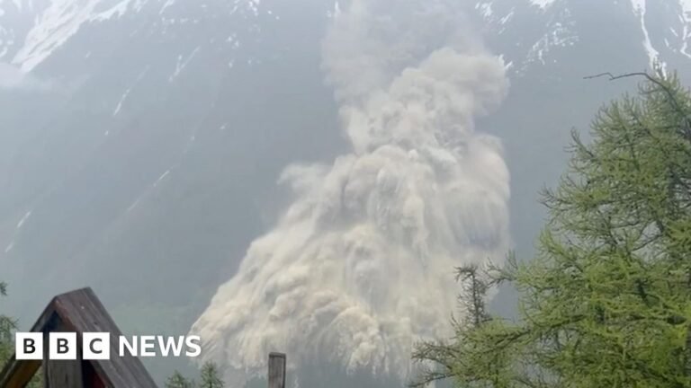 The Swiss village of Blatten was partially destroyed after a huge piece of glacier crashed into the valley, flood plains and destroyed houses. The drone shots showed much of the birch glacier, which collapsed around 3:30 pm (14:30 BST) on…