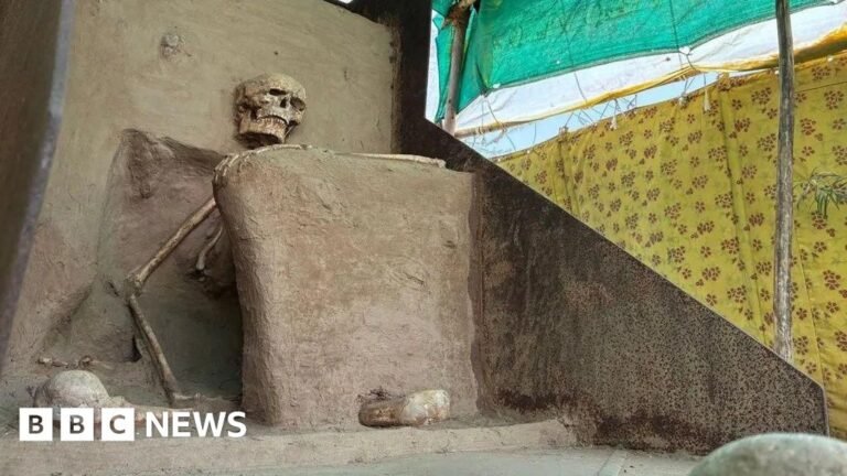 Roxy Gagdekar Chhara BBC Gujarati, Vadnagar Kushal Batunge/BBC The right hand of the skeleton rests on his lap and his left hand lies in the air as if resting on a stick A 1000-year-old human skeleton, who was buried, sat…