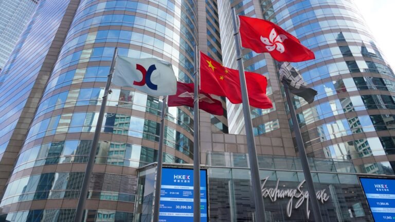 Chinese and Hong Kong flags tremble as the screens show the Hang Seng Index outside the Exchange Square complex, which houses the Hong Kong Stock Exchange, on January 21, 2021 in Hong Kong, China. Zhang Wei | China News Service…