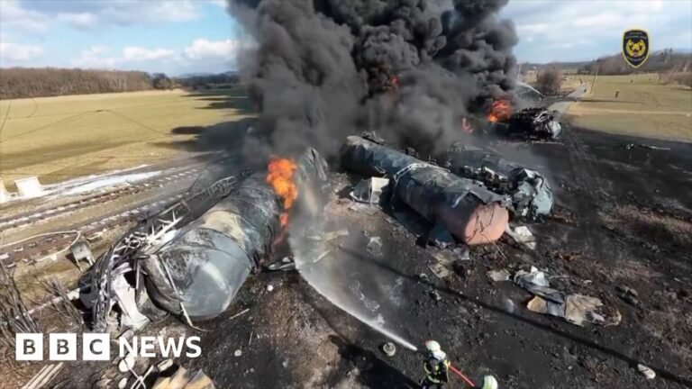 Watch: Fire on the Czech Republic, viewed in drone footage A freight train, carrying the highly toxic chemical benzene, has derailed in the Czech Republic, causing a huge fire. Several tankers and locomotive were lit, with firefighters from several regions…