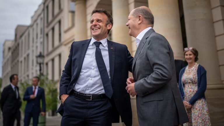 German Chancellor Olaf Scholz greets French President Emmanuel Macron before a private dinner at the Kochzimmer restaurant in Potsdam near Berlin, Germany, June 6, 2023. Michael Kappeler | Pool | via Reuters Last year was tough for the eurozone with…