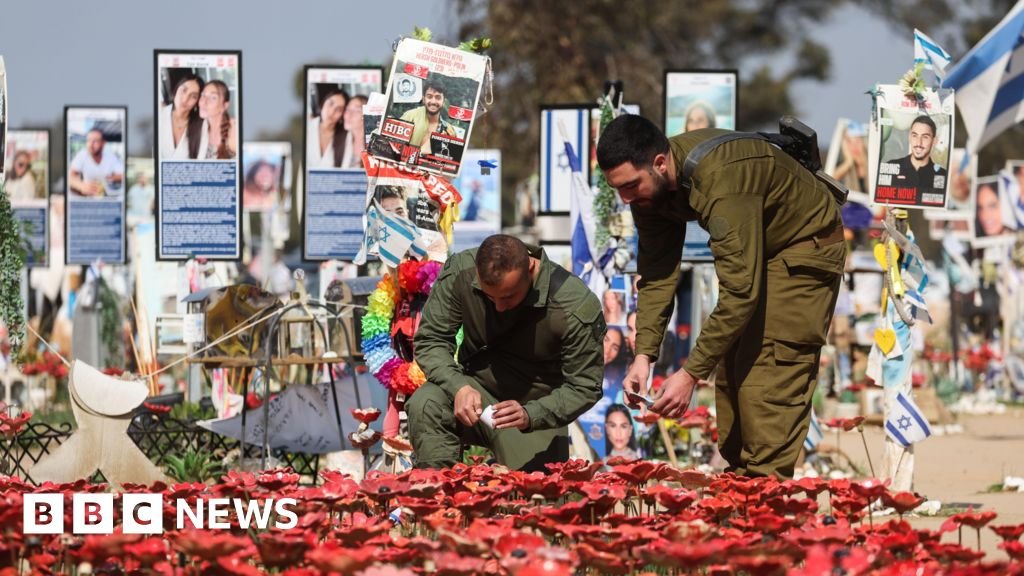 EPA Israeli soldiers bright candles on a memorial site for the victims of the Hamas attack at the Supernova Music Festival on October 7, 2023, near Kibbutz Reim, South Israel (January 31, 2025)EPA