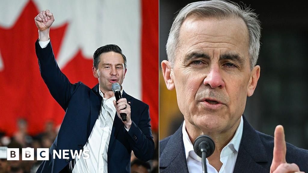 The ghetto images composite image showing on the left, conservative leader Pierre Polyver, who holds his hand while talking in a microphone at a rally, with a Canadian flag behind him. To the right of Liberal Mark Carney, also speaking in a microphone. Ghetto images