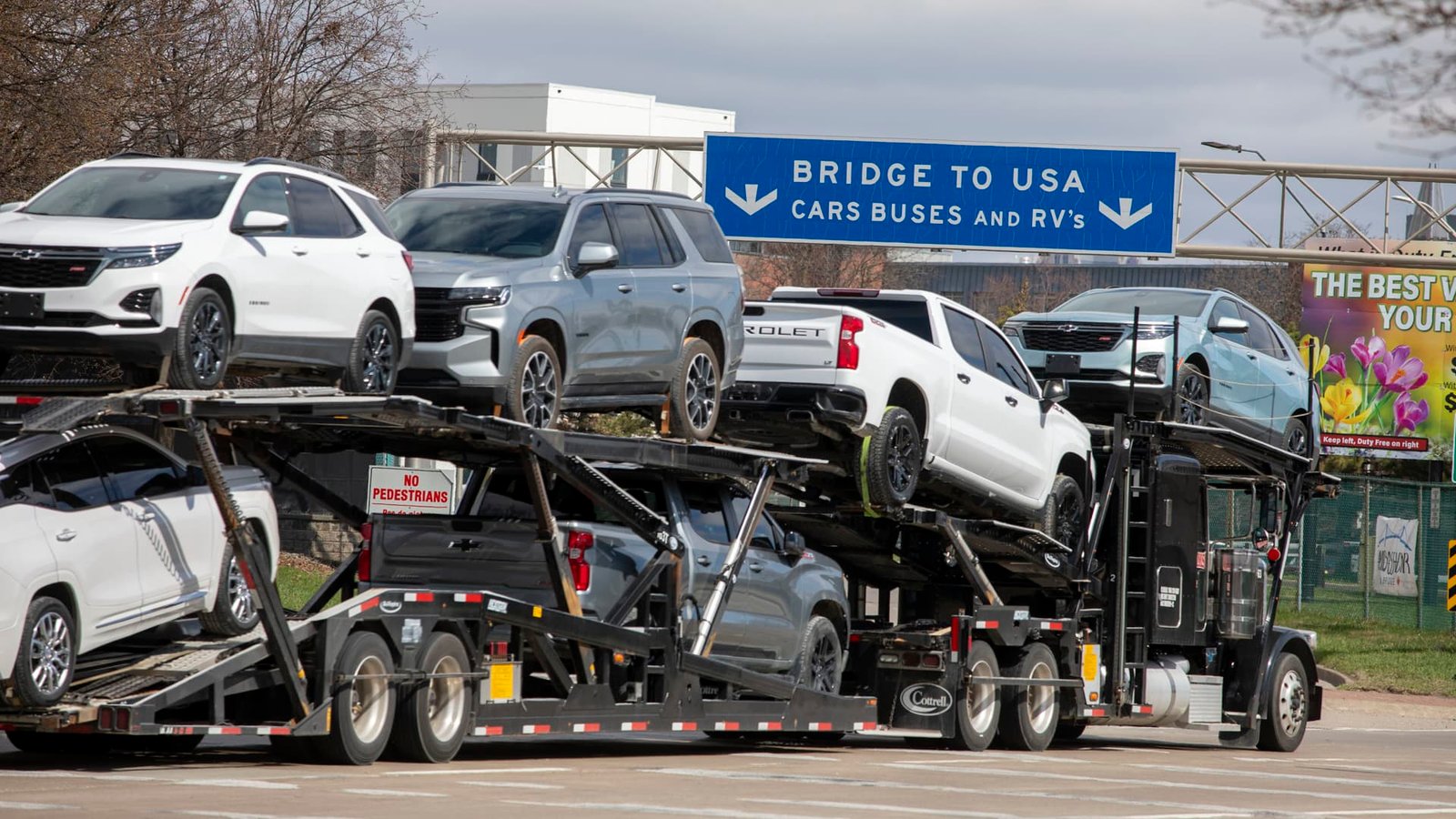 The trucks make their way to the ambassador’s bridge to cross the United States in Detroit on April 1, 2025 in Windsor, Canada.