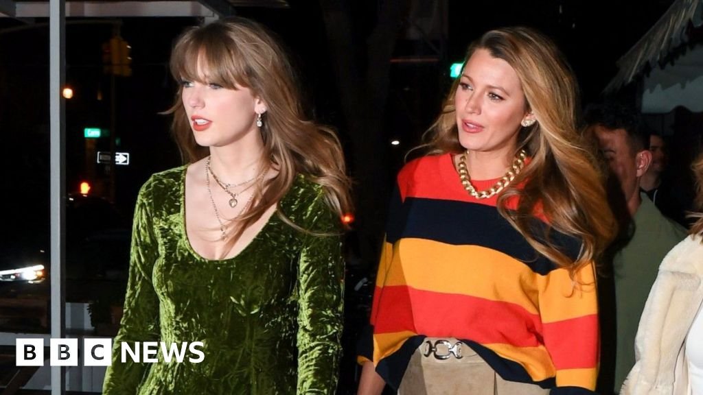 Getty Images Taylor Swift, dressed in a green velvet dress, walks with Blake Lively, wearing a black, red and orange jumper, at night in New York in 2023.Ghetto images