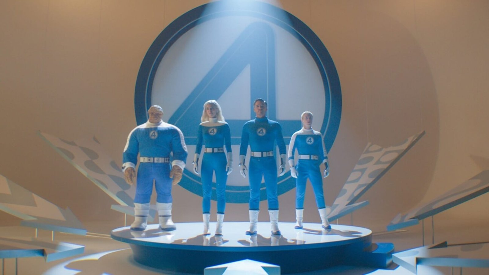 (LR): EBON MOSS-BACHRACH like Ben Grimm/The Thing, Vanessa Kirby as a Sue Storm/Invisible Woman, Pedro Pascal as Reed Richards/Mr. Fantastic and Joseph Quinn as Johnny Storm/Human Facla in Marvel’s Fantastic Four: The First Steps.